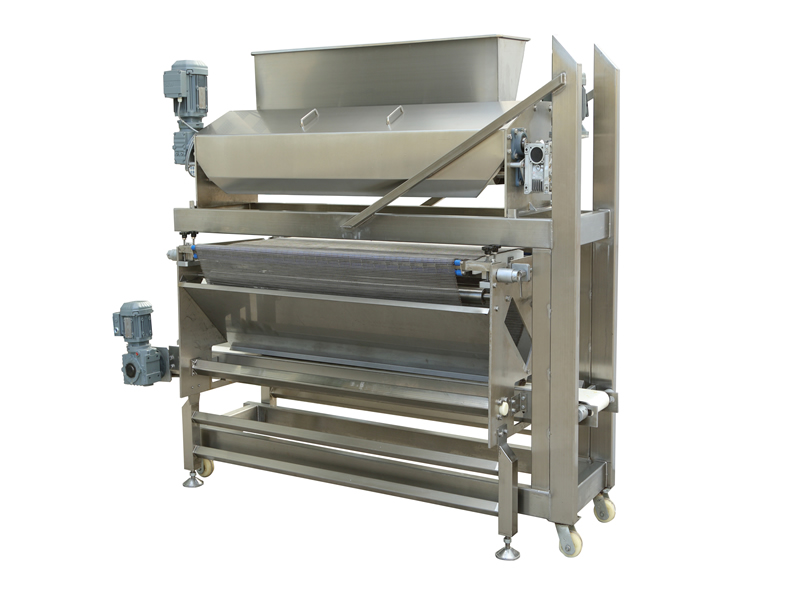 該設(shè)備應(yīng)用于將固體顆粒或者粉狀調(diào)味料,鹽,糖,芝麻及果仁片等撒布在面皮或則餅干上?;厥諜C(jī)回收多余的撒布物料循環(huán)利用。